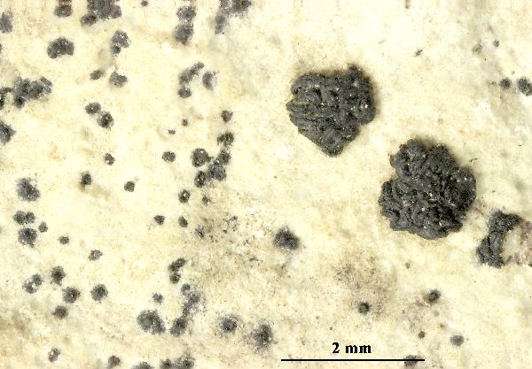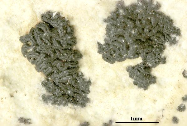 Description: Thallus crustose, endosubstratic, poorly evident, yellowish white, often delimited by a black prothallus. Apothecia lirelliform, black, epruinose, 0.3-1 x 0.1-0.2 mm, simple or weakly dichotomously branched, laterally anastomosing, straight to curved, prominent, aggregated into 2-3 mm wide, stellate to irregular clusters of 10-20 apothecia, with a slit-like disc. Proper exciple dark brown to black, extending below the hymenium, brittle, the external layer of cells c. 2-3 µm wide, with strongly occluded lumina; epithecium brown; hymenium colourless, I- or I+ yellowish; paraphysoids highly branched and densely anastomosing, c. 2 µm thick; hypothecium dark. Asci 8-spored, clavate, bitunicate, with an evident ocular chamber, K/I- (but cytoplasm usually yellowish brown). Ascospores 1-septate, slightly constricted at septum, one cell slightly shorter and wider than the other, at first hyaline then pale brown, 12-16 x 4-6 µm, with a very thin perispore, the wall ornamented. Pycnidia frequent, half to totally immersed, carbonaceous in upper part, colourless in lower part, producing either macro- or microconidia. Macroconidia simple, ellipsoid, 7-11 x 3-5 µm; microconidia narrowly ellipsoid to bacilliform, 4-8 x 1-2.5 µm. Photobiont trentepohlioid. Spot tests: K-, C-, KC-, P-, UV-. Chemistry: without lichen substances.Note: a mild-temperate lichen found on compact calcareous rocks in shaded, microclimatically stable situations, often under overhangs; the species seems to be most frequent in Tyrrhenian Italy. For further details see Tretiach & Modenesi (1999).