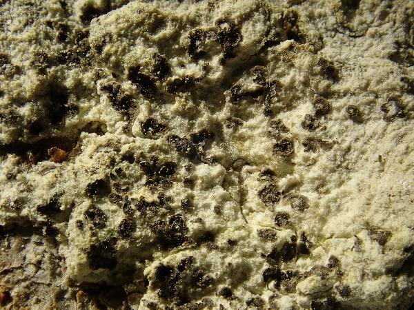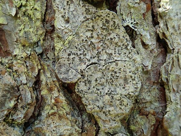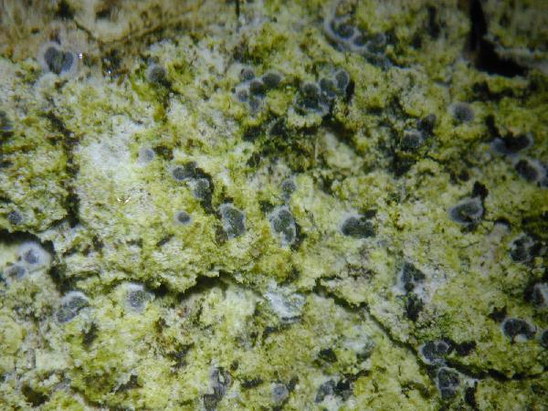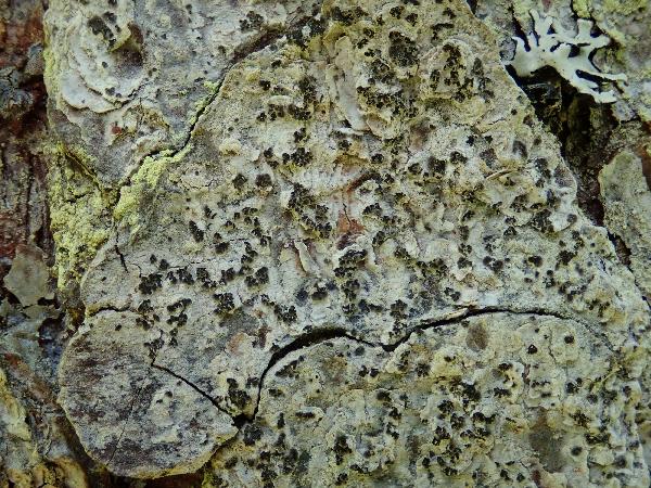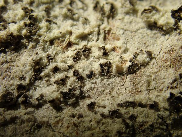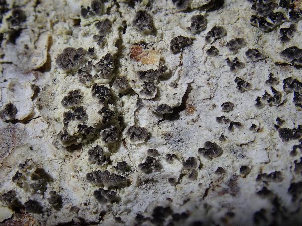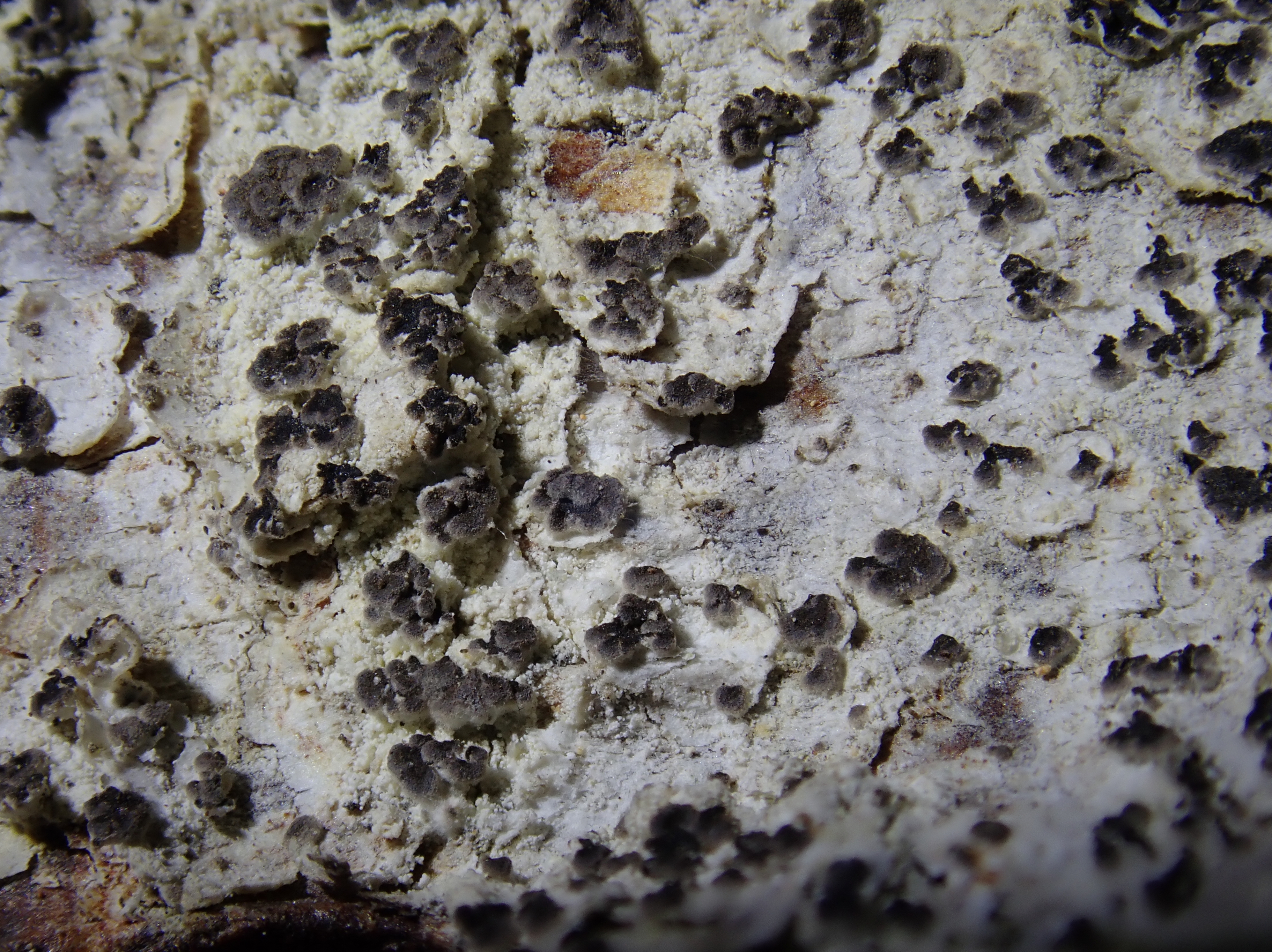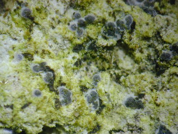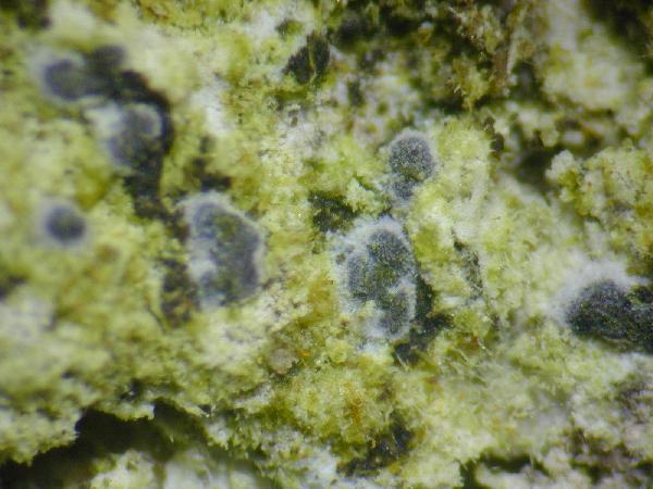 Description: Thallus crustose, white to pale yellowish white, smooth to granulose or arachnoid, sometimes inapparent, the hyphae K/I-. Apothecia 1-2 mm across, irregularly rounded to weakly lobed or star-shaped, sometimes short-lirelliform, with a dark brown to black, but more or less grey-pruinose disc and a somewhat arachnoid, slightly prominent, whitish marginal zone. Proper exciple dark brown, of densely entangled hyphae, with a marginal layer of hyaline to pale brown, branched and anastomosing hyphae with cylindrical cells; epithecium brown, K+ yellowish green; hymenium colourless to pale yellowish brown, 25-60 μm high, weakly amyloid; paraphysoids strongly coherent, brown-walled, 1-1.5 μm thick in lower part, the apical cells up to 2 μm wide, without a dark cap, the densely intertwined tips often extending horizontally; hypothecium dark brown, 35-70 µm high. Asci 8-spored, broadly clavate, semi-fissitunicate, with a large apical dome and a distinct ocular chamber, lacking hemiamyloid tholus structures. Ascospores 3-4-septate, hyaline (but overmature spores often brownish and finely warted), oblong-ovoid, widest above the middle, (9-)11-17(-19) x 3-5.5 µm, with subequal cells. Photobiont trentepohlioid, the cells thick-walled, 15-40 x 8-30 μm. Spot tests: thallus K+ pale pale yellow to brownish orange, C-, KC-, P- or P+ orange, UV-. Chemistry: two unknown substances in thallus.Note: on bark of conifers in old-growth forests under suboceanic climatic conditions; widespread in the temperate to boreal zones of the Holarctic region, in the Alps mainly in the montane belt, but lacking in the central Alps with more continental climate conditions. It is included in the Italian red list of epiphytic lichens as “Critically Endangered” (Nascimbene & al. 2013c).