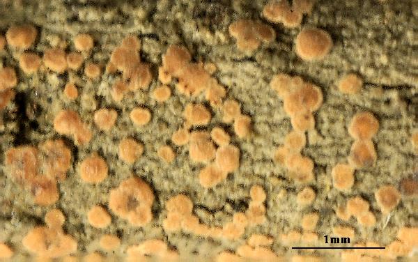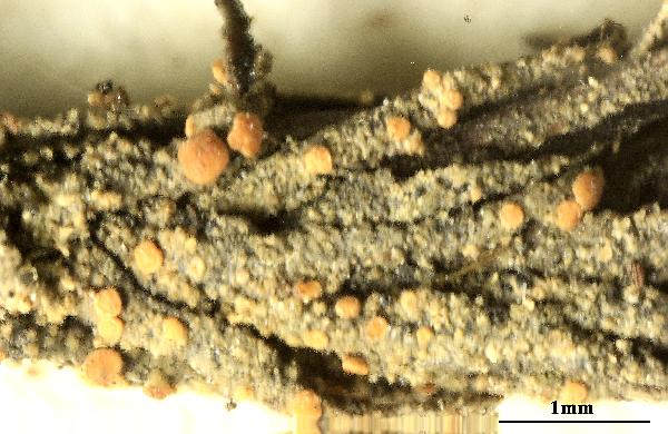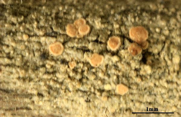 Description: Thallus crustose, episubstratic, 0.1-0.5 mm thick, grey-green, often shiny, smooth to granulose, esorediate. Apothecia biatorine, clustered towards thallus center, 0.1-0.5 mm across, with a flat to finally convex, whitish, pale grey-pink to pale brown disc, and a thin, paler, finally excluded proper margin. Proper exciple well-developed, thin, more or less colourless; epithecium, hymenium and hypothecium colourless; hymenium 40-60 µm high, I+ blue; paraphyses simple or sparingly branched, 0.5-1 µm thick at base, the apical cells to 2 µm wide. Asci 8-spored, clavate, with a K/I+ blue apical dome containing a darker blue, tubular ring-structure, and an amyloid coat, Byssoloma-type. Ascospores (1-)3-septate, narrowly fusiform to clavate-fusiform, sometimes slightly curved, 10-16 x (2.5-)3.5-4.5(-5) µm. Pycnidia pinkish white, 0.1-0.3 mm across, immersed to emergent and thorn-like with a long neck. Conidia pear- or drop-shaped to almost ellipsoid, 3.5-4.6 x c. 1.5 µm. Photobiont chlorococcoid. Spot tests: thallus K-, C-, KC-, P-, UV-. Chemistry: without lichen substances. Note: on twigs of small shrubs (e.g. Vaccinium, Calluna), more rarely on mosses (e.g. Polytrichum) and on twigs of Picea in cold sites, on north-facing slopes or in deep gorges, usually in upland areas; perhaps more widespread in the Alps. It is included in the Italian red list of epiphytic lichens as “Endangered” (Nascimbene & al. 2013c).