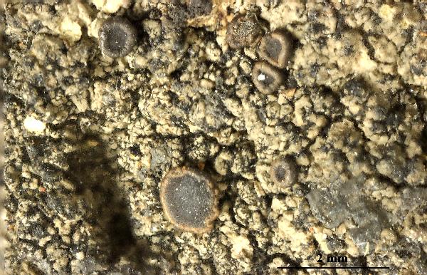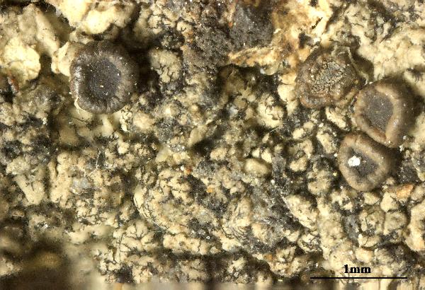 Description: Thallus crustose, episubstratic, continuous to rimose, pale grey to grey-brown, often delimited by a black prothallus, the areoles 0.2-0.4(-0.5) mm wide, contiguous, thin, slightly to strongly convex. Medulla I-. Apothecia lecideine, 0.5-2 mm across, often gathered in up to 3 mm wide clusters, sessile, at first rounded but soon very irregular in outline, with a black-brown, flat, sometimes thinly pruinose disc, and a usually slightly paler, persistent, strongly wavy proper margin. Proper exciple brown in outer part, paler within; epithecium brown; hymenium colourless or pale brown in upper part, 55-75 μm high; paraphyses weakly coherent, simple or sparingly branched in upper part, 1.5-2 μm thick at mid-level, the apical cell clavate, to 4 μm wide; hypothecium colourless. Asci 8-spored, clavate, with a thin external and internal K/I+ dark blue cap surrounded by a thick K/I+ pale blue apical cap, and with a K/I- apical tube in tholus, Fuscidea-type. Ascospores 1-celled, hyaline broadly ellipsoid to subglobose, (6-)9-12(-13) x 6.5-9 μm. Pycnidia black-brown in upper part. Photobiont chlorococcoid. Spot tests: thallus K-, C-, KC-, P-, UV-; apothecia UV+ bluish white. Chemistry: thallus without lichen substances; apothecia with divaricatic acid.Note: on steeply inclined to rain-sheltered surfaces of hard siliceous rocks in upland areas; in Italy hitherto reported only from South Tyrol.