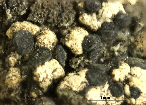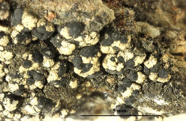 Description: Thallus small-squamulose to subcrustose, whitish to pale grey, often green-spotted, appearing maculate when wet, dull, epruinose or completely covered with a white pruina. Squamules up to 1.5 mm wide, flat to slightly convex, with flexuose margins, scattered to aggregated (often on a black cyanobacterial mat). Upper cortex c. 50 μm thick, lacking crystals and epinecral later; algal layer discontinuous; medulla white, without crystals. Apothecia frequent, lecideine, strongly constricted at base, up to 1 mm across, with a black, epruinose, flat disc and a distinct, smooth, brown-black (paler than disc), glossy proper margin. Proper exciple dark reddish brown, K-, N-; epithecium brown-green, dark olivaceous green to green, K-, N+ violet; hymenium colourless to straw-coloured, 60-65 μm high; paraphyses not conglutinated, simple or sparingly branched and anastomosing in upper part, thin-walled, the apical cell distinctly swollen and covered by a gelatinous pigment cap; hypothecium dark reddish brown. Asci 8-spored, clavate, surrounded by a gelatinous I+ blue coat, with a well-developed I+ blue tholus, an I+ darker blue tube and a well-developed ocular chamber, Bacidia-type. Ascospores (1-)3-septate, hyaline, cylindrical with pointed ends, (14-)16-29(-35) x 3.5-5 μm. Pycnidia dark, immersed. Conidia filiform, sickle-shaped, 10-12.5 x c. 1 μm. Photobiont chlorococcoid. Spot tests: thallus K-, C-, KC-, P-, UV-. Chemistry: thallus without lichen substances.Note: for a long time considered as a synonym of T. aromatica, this seems to be a good species, characterized by the larger ascospores with pointed ends. It grows on more or less calciferous rocks in upland areas and is known from the British Isles (Cannon & al. 2021) and the French Alps (see Roux 2020). To be looked for in the Italian Alps.